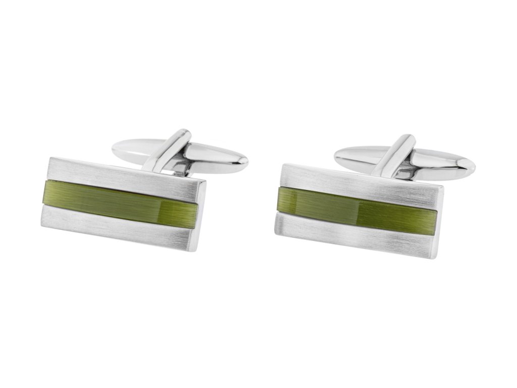 Tento sofistikovaný manžetový knoflíček je nezbytným doplňkem pro každou formální příležitost nebo slavnostní oděv ženicha. Tento mimořádně kvalitní kousek je vyroben ze špičkového rhodia a zeleného barevného kamene cateye, což mu dodává luxusní a elegantní vzhled.