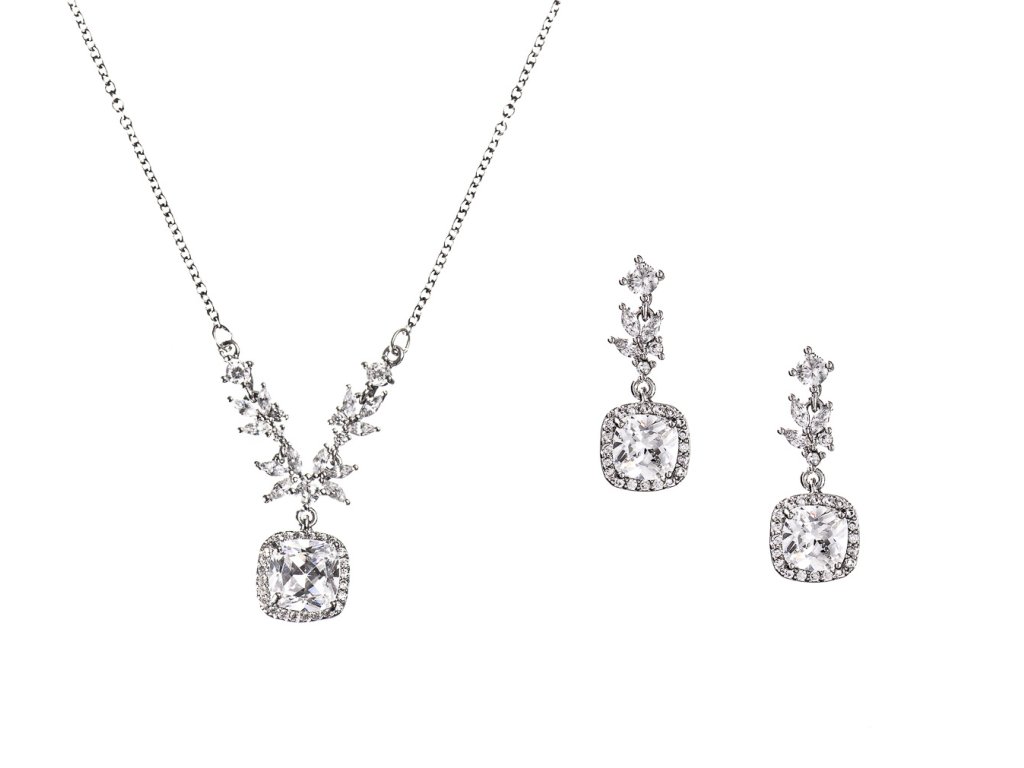 Tato nádherná sada svatebních šperků obsahuje úžasné krystaly kubické zirkonie. Sada šperků je rhodiovaná.
