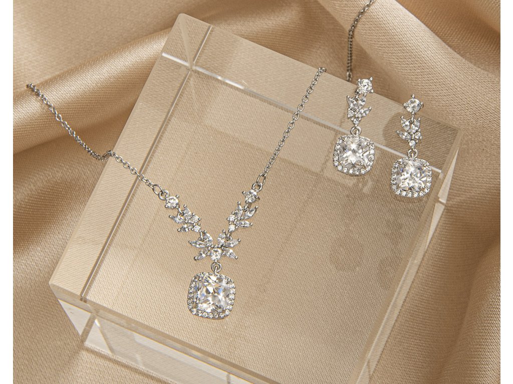 Tato nádherná sada svatebních šperků obsahuje úžasné krystaly kubické zirkonie. Sada šperků je rhodiovaná.