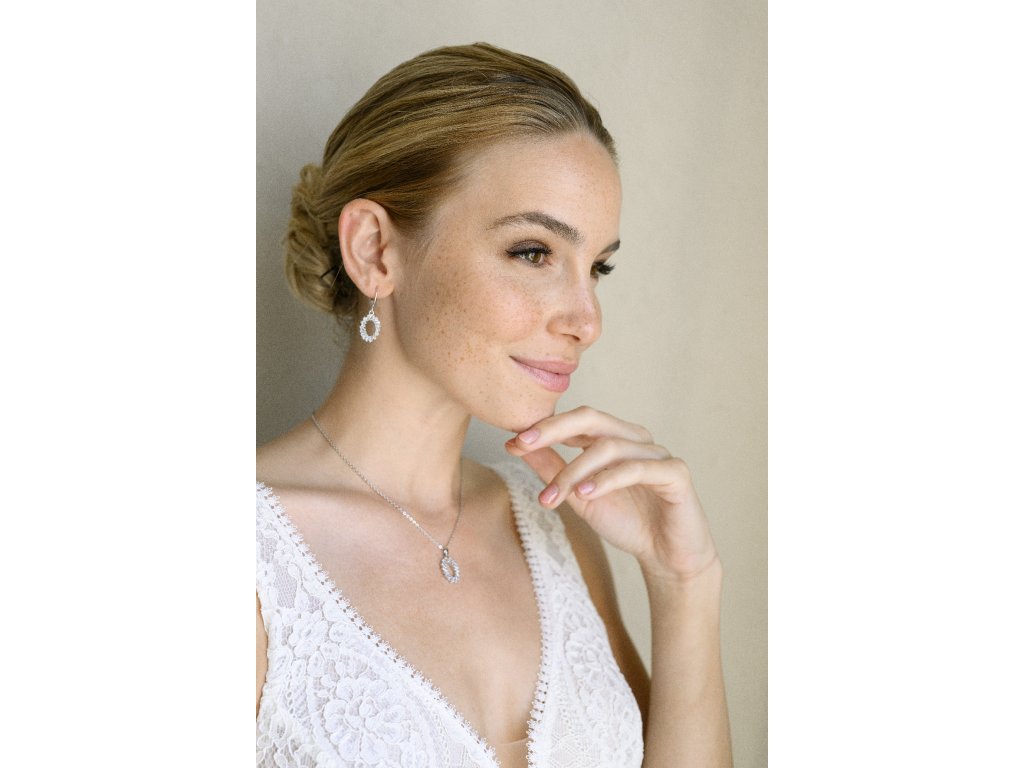 Tato nádherná sada svatebních šperků obsahuje úžasné krystaly kubické zirkonie a slonovinové perly. Sada šperků je rhodiovaná.