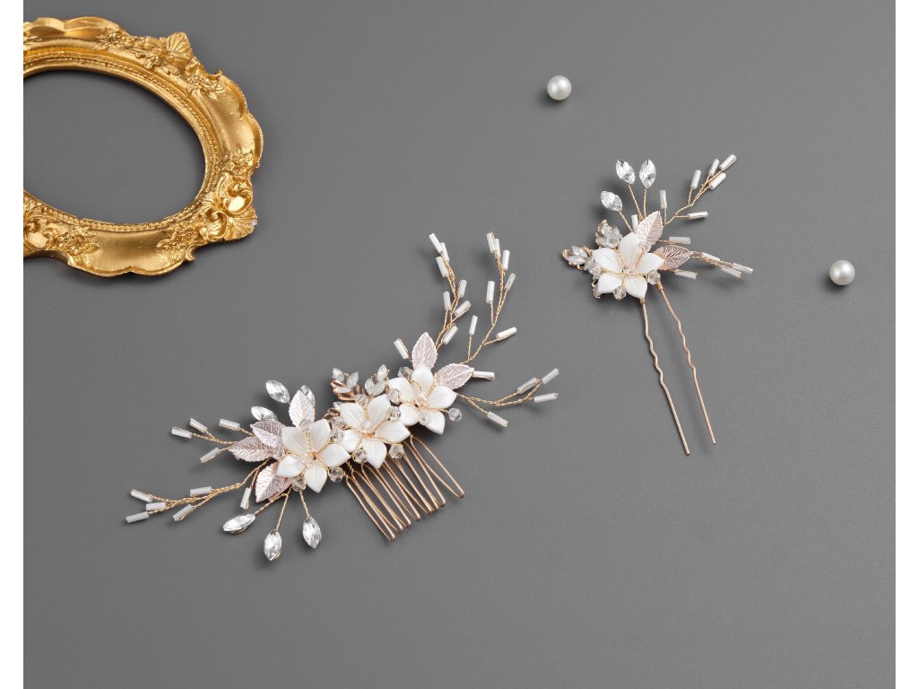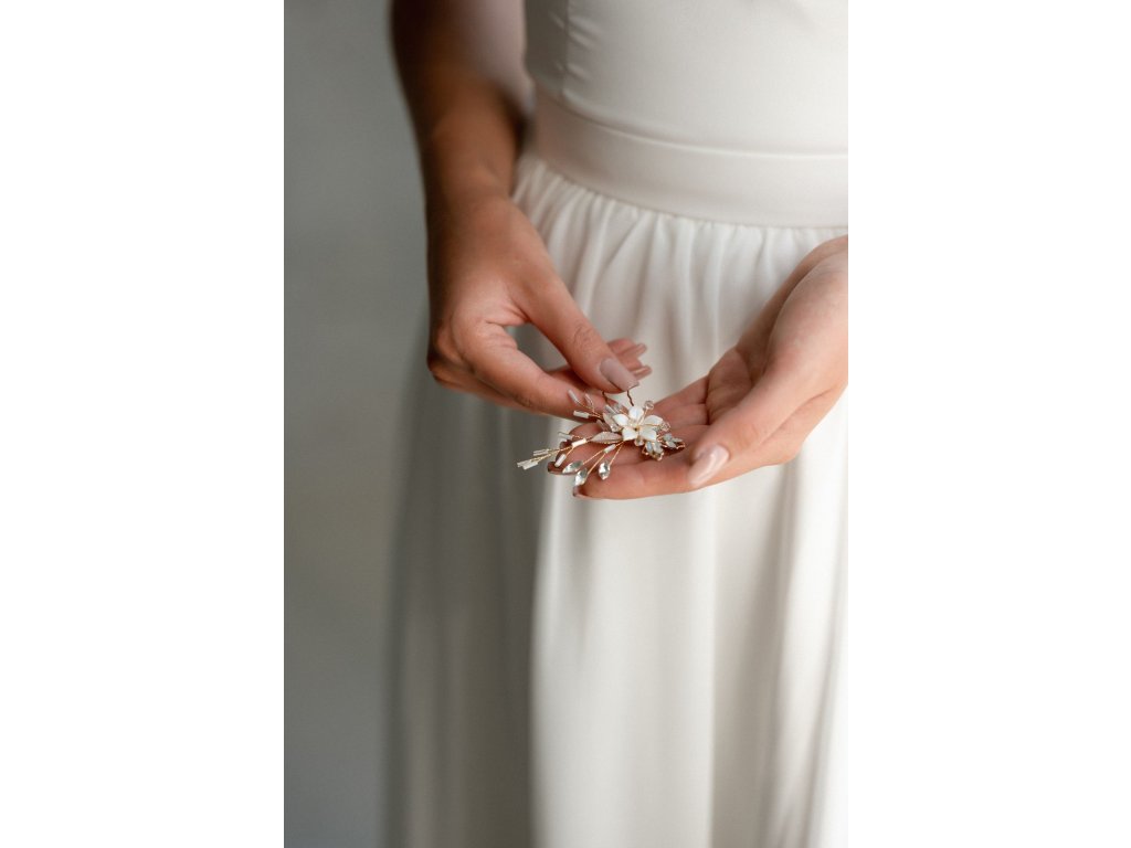 Úchvatná svatební spona do vlasů v barvě růžového zlata s ručně vyrobenou sestavou drahých kamínků.