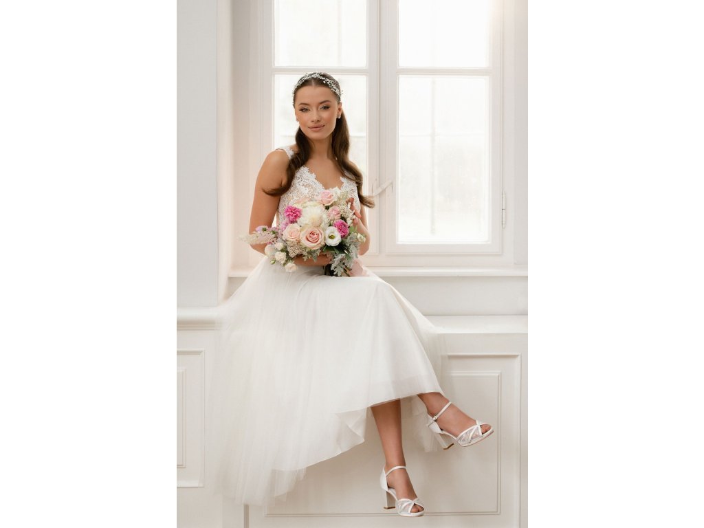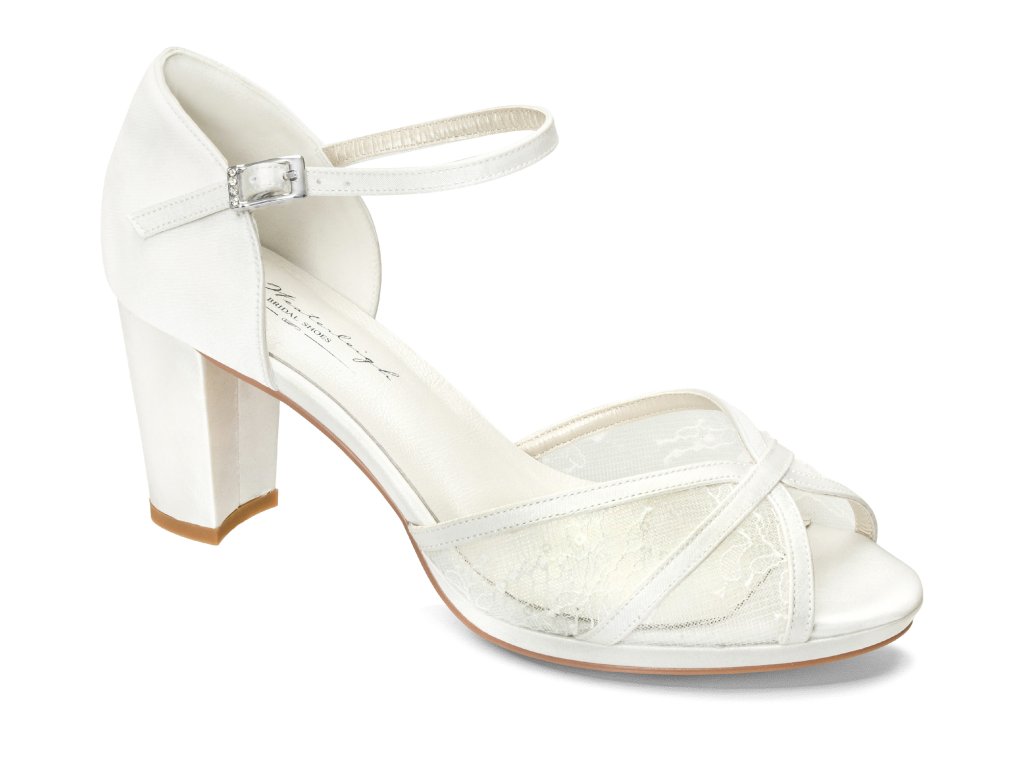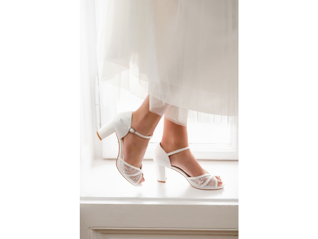 Madeline jsou speciální, ručně vyráběné svatební boty s průhlednou krajkou. Přední díl zdobí romantický květinový vzor. Díky středně vysokému podpatku a platformové podrážce nabízí tato bota nebeský komfort po celý den. Měkké gelové polstrování a kožená stélka také zajišťují opravdu pohodlné nošení.